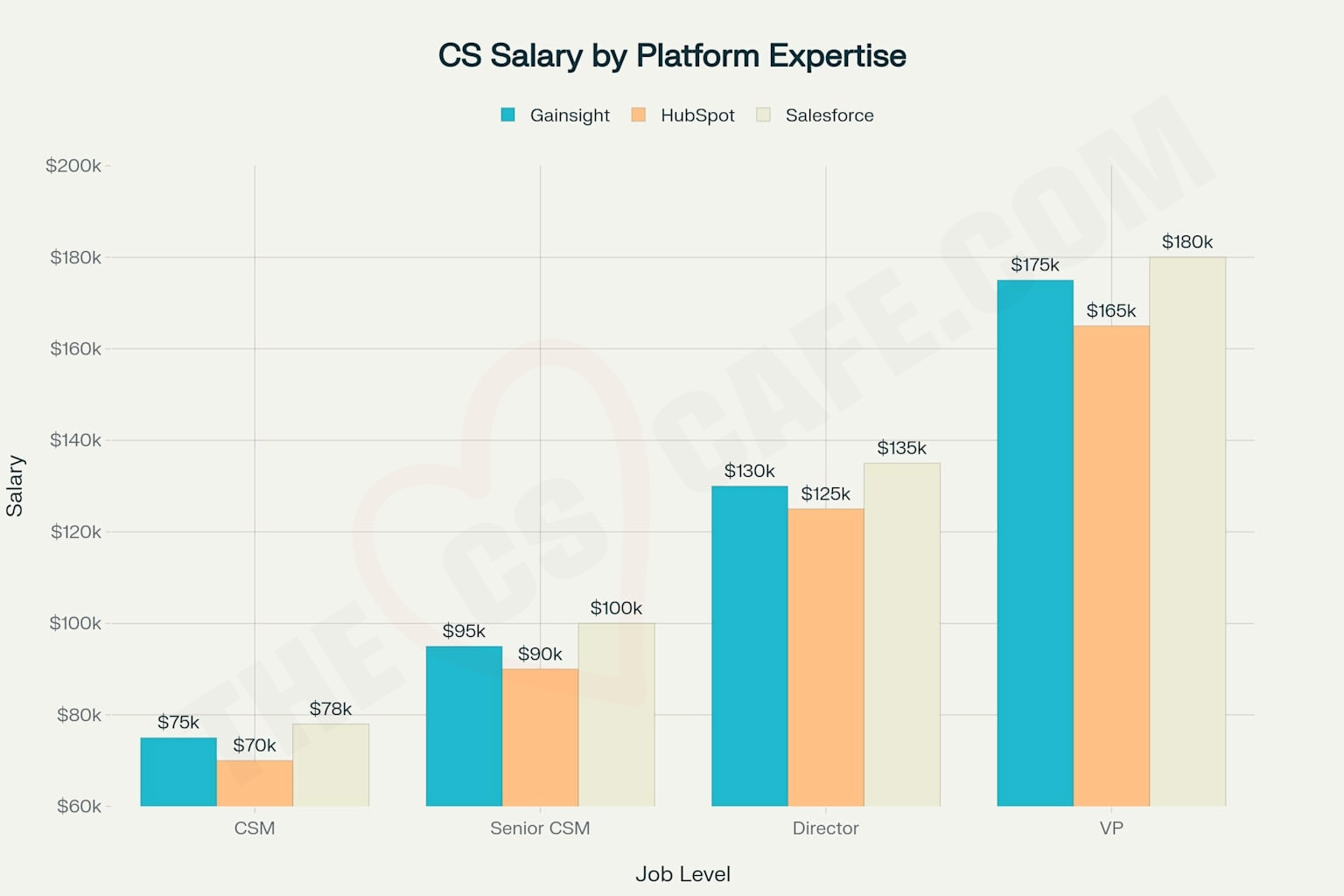 Customer Success career salary progression varies significantly based on platform expertise. Salesforce generally gets you the highest premiums at senior levels.